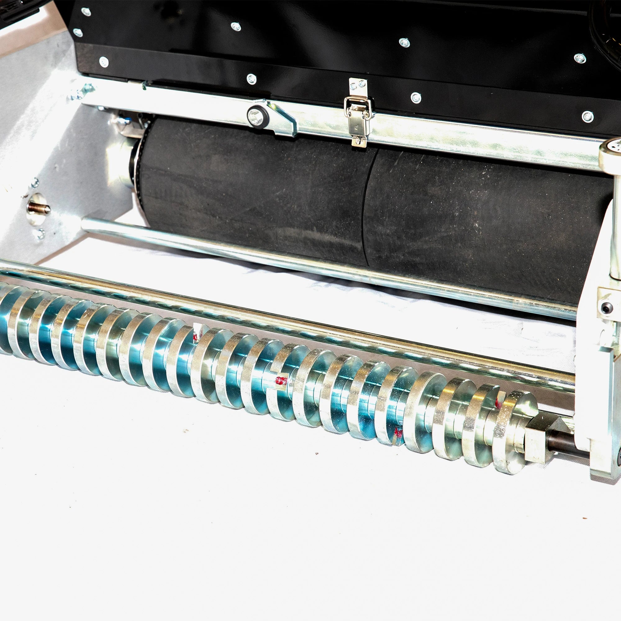The C27E uses a combination of a grooved front roller and a heavy, rubberised steel rear roller with a differential. This setup ensures excellent weight distribution and smooth turning while precisely bending the grass blades to create the sharp, defined stripes that Allett mowers are famous for.