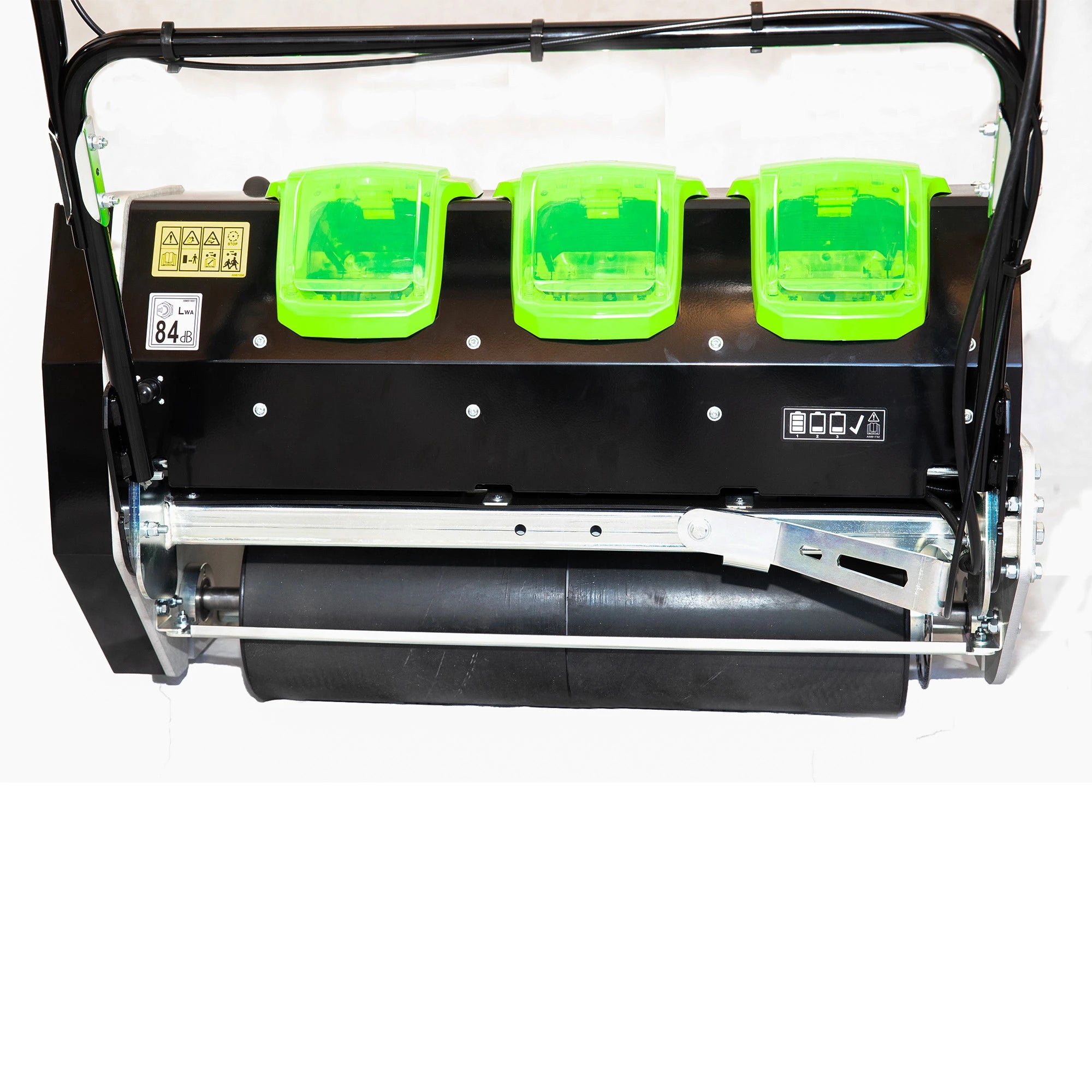 The C27E/2 is powered by three 82V 8Ah Lithium-Ion Cramer batteries, which power both the mower and its interchangeable cartridges. This system offers an impressive runtime of up to 2 hours and 45 minutes on a full charge, with each battery recharging in just 90 minutes. For enhanced productivity on larger jobs, the mower can be operated with one, two, or three batteries, allowing for continuous work while others are charging. The efficient brushless drive motors ensure reliability and consistent performance, and the batteries are cross-compatible with the Allett Uplift86E and other Cramer products.