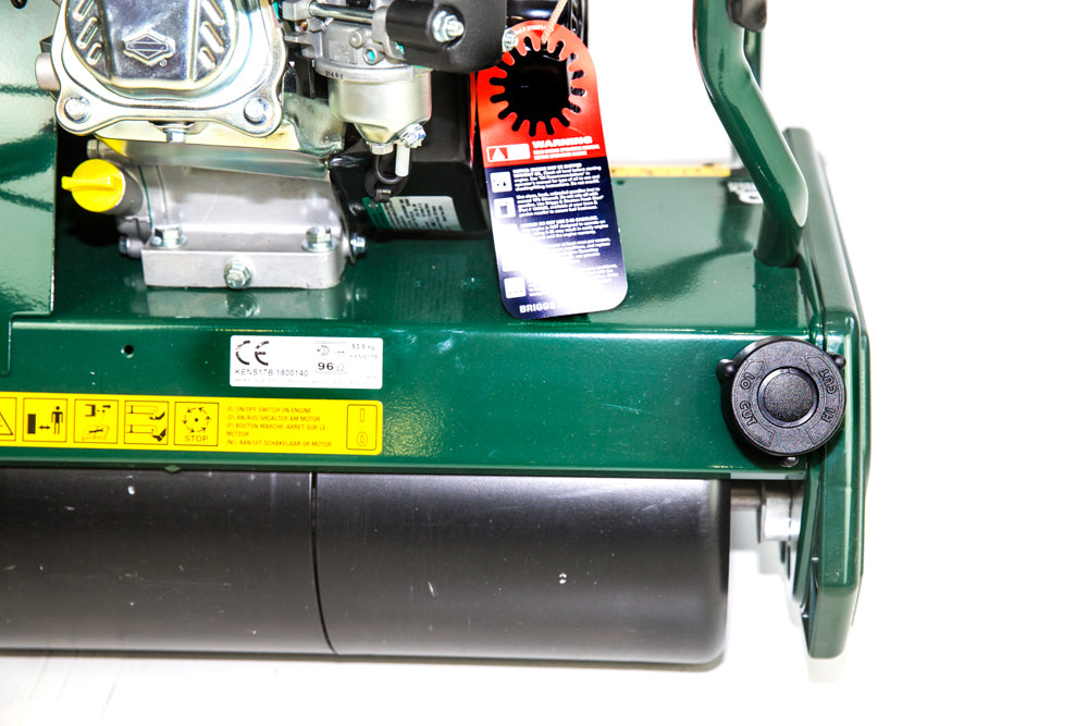 The Allett Kensington 17 is available with a choice of two highly regarded petrol engines to suit user preference. Customers can select either the dependable 127cc XR550 Briggs & Stratton engine or the robust 122cc GX120 Honda engine. Both options provide ample power for the self-propelled drive system and the cutting cylinder, ensuring consistent performance even in lush grass. A 2-litre fuel tank provides generous runtime for larger tasks.