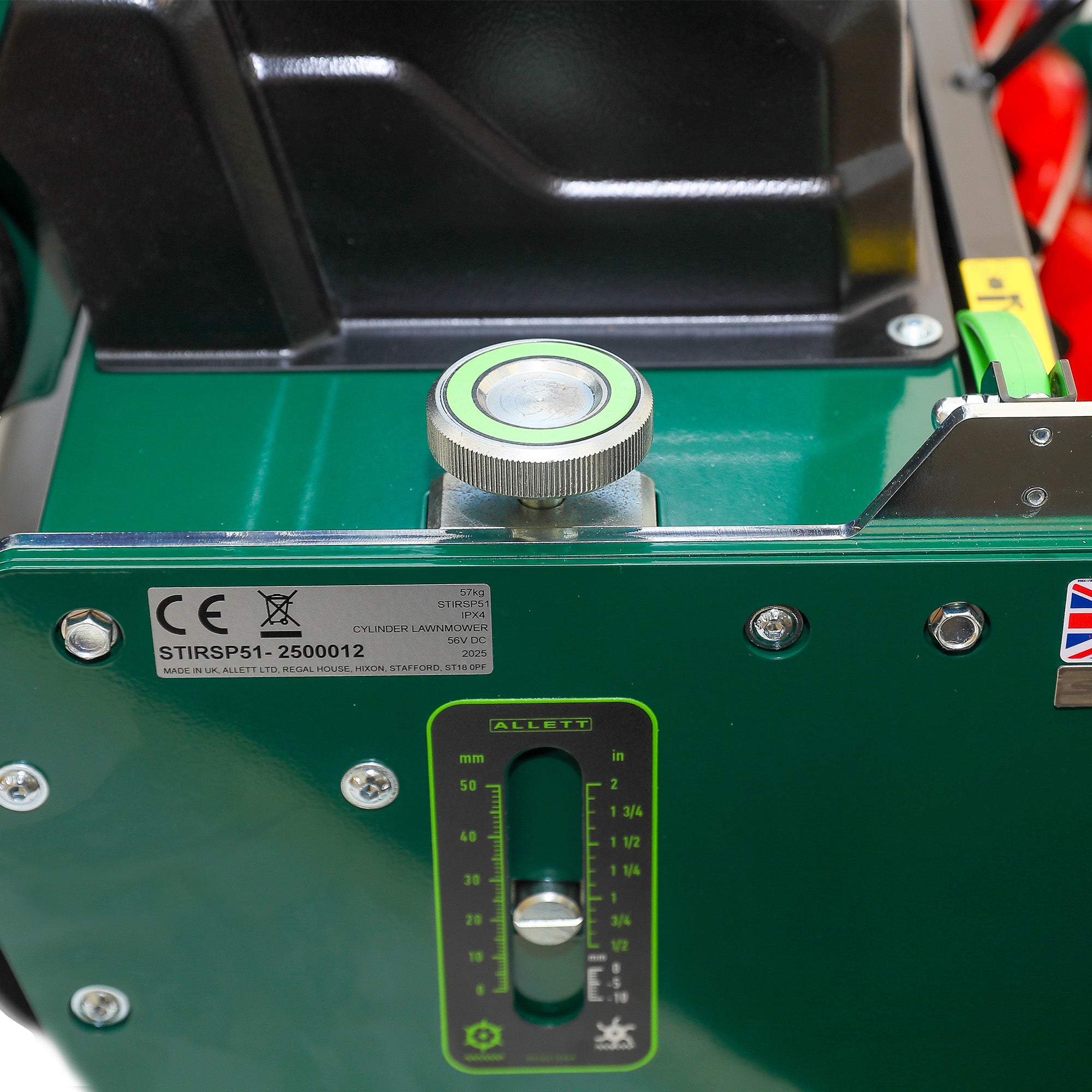 Engineered for precision, the Stirling 51 SPORT comes standard with a 10-bladed cylinder featuring a thinner front-edged blade, perfect for achieving the close shave required on fine sports turf. The machine’s SureBlade™ system incorporates a thicker, more rigid bottom blade for easier, more accurate setting and a consistently clean cut. The height of cut is managed by Allett’s HiteRite™ system, which provides stepless micro-adjustment from 3mm to 50mm, with a clear scale for perfect accuracy. Stability is further enhanced by the front roller locking kit, which reduces flex to maintain a consistent cutting height—essential for the precision demanded by bowls and cricket.