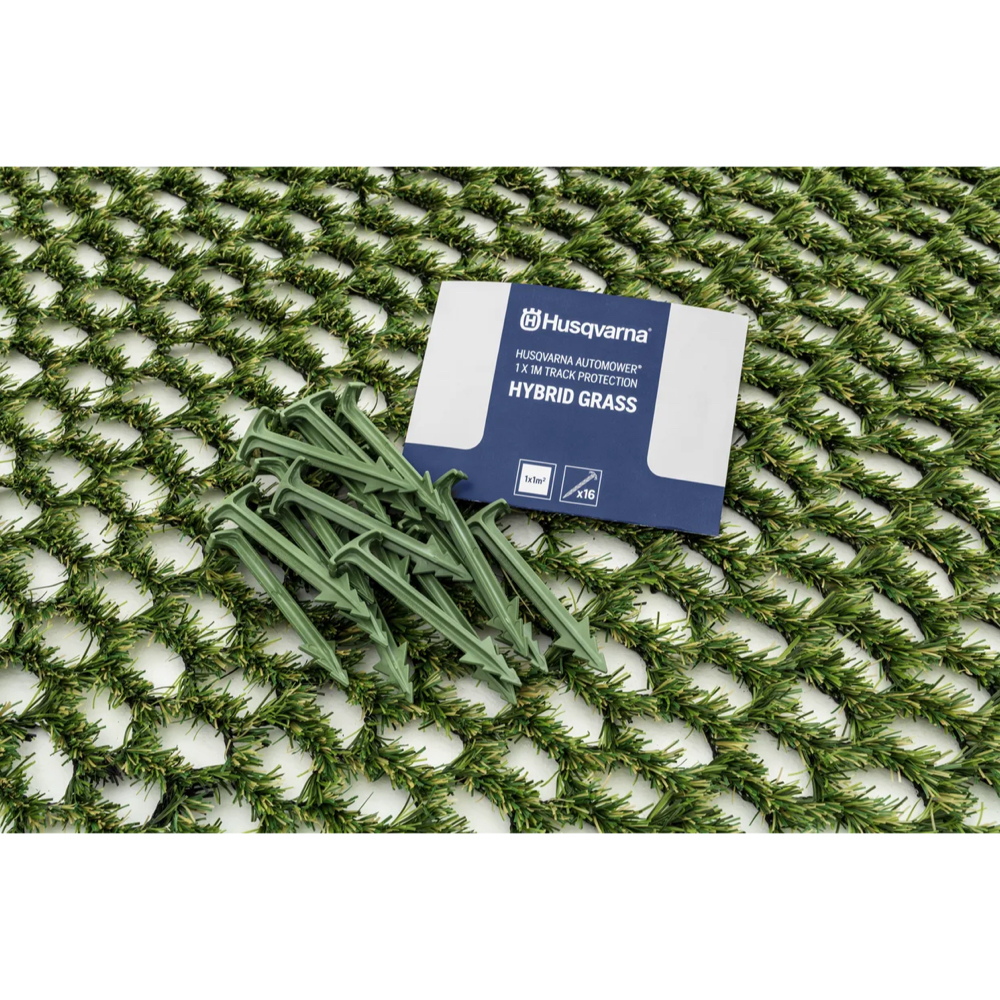 Hybrid grass provides grip to the robotic mower for improved capacity in narrow and steep areas. 1×1 meter hybrid grass including 16 green stakes.