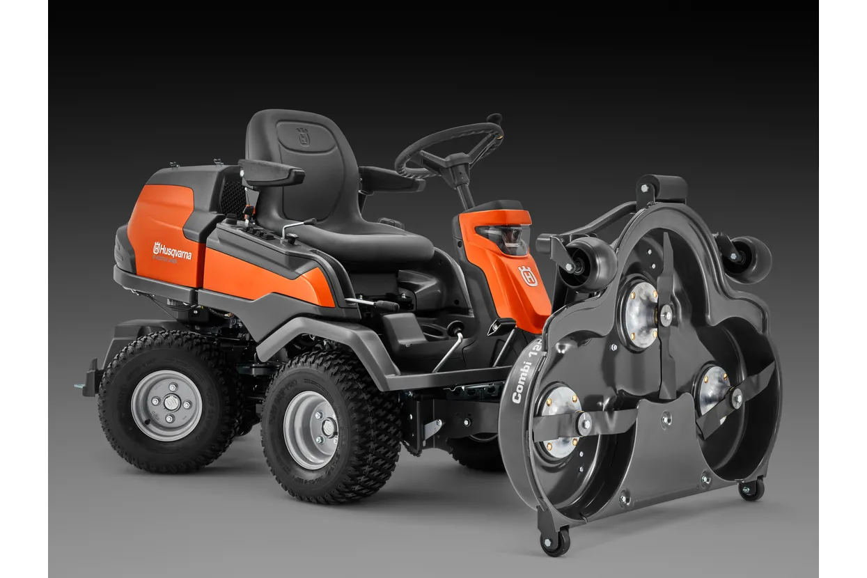 Please note, the R 420TsX AWD is delivered deckless. This allows you to choose the perfect cutting deck for your requirements. It is compatible with Husqvarna’s 112cm and 122cm Combi cutting decks, which offer both BioClip® (mulching) and rear-discharge cutting methods. The front-mounted position provides excellent reach under bushes and into corners, while the floating design follows ground contours to prevent scalping. A service position makes deck maintenance and cleaning straightforward.
