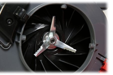 – Metal tri-blade impellor shreds leaves before they enter the large 50 liter collection bag