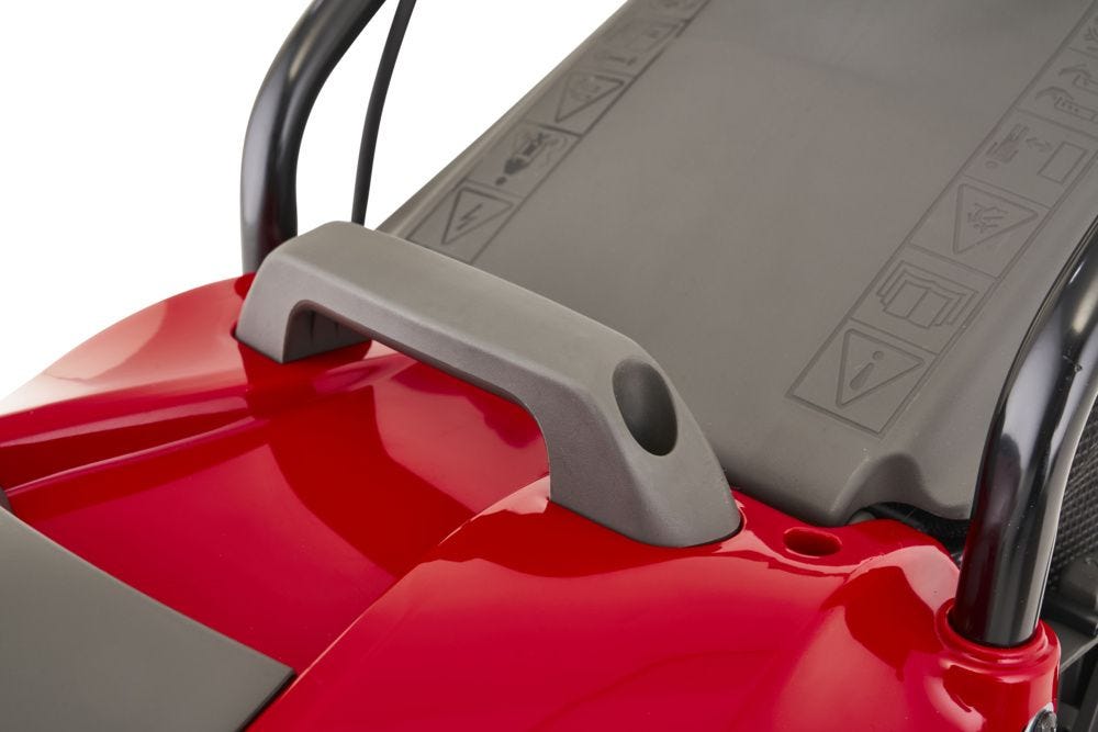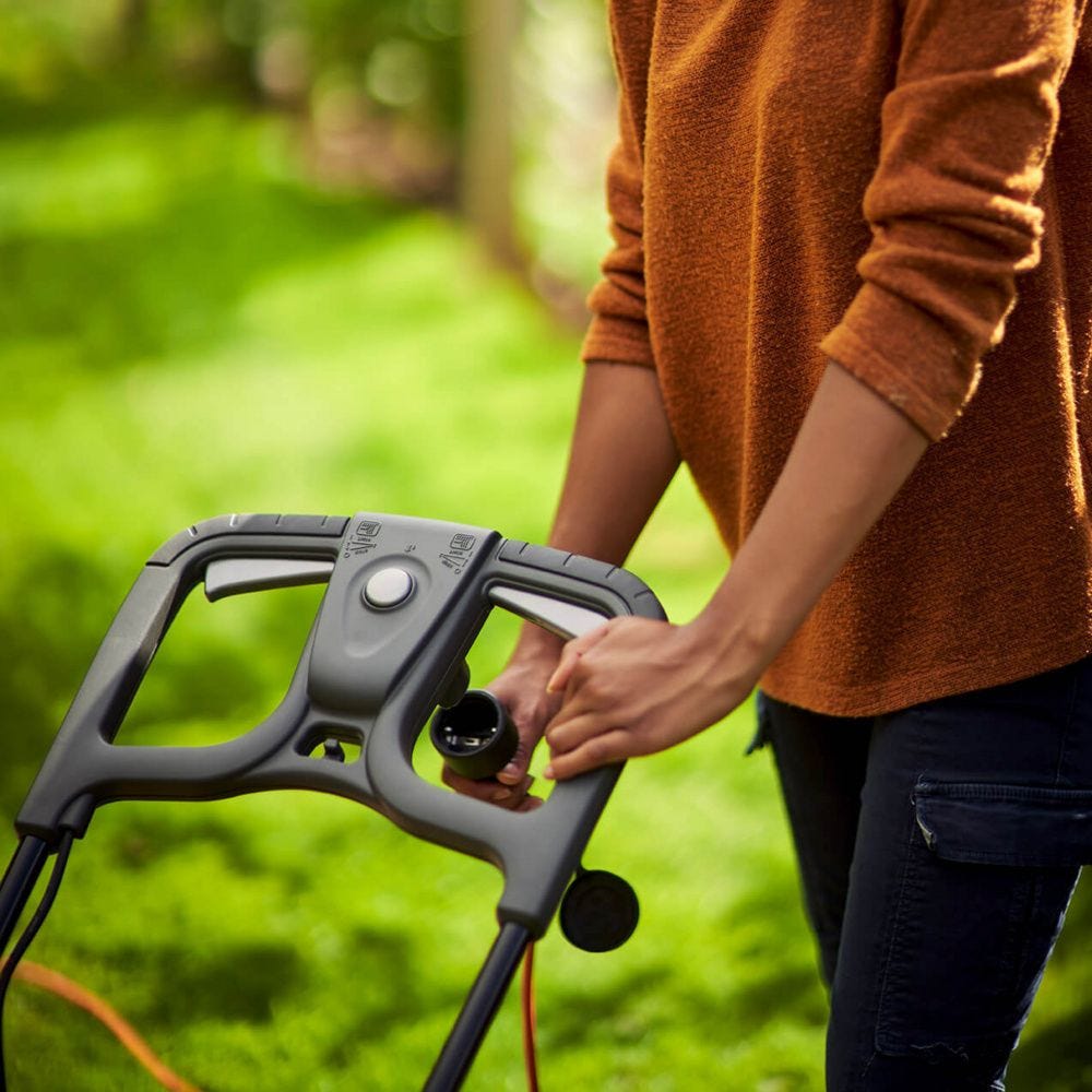Achieving a pristine lawn finish is simple with the Princess 34. It features an integrated rear roller that creates a light, classic striped effect. The cutting height can be easily adjusted through six positions, from 25mm to 75mm, using a single centralised lever for ultimate convenience. The durable yet lightweight polypropylene chassis ensures longevity and makes the mower easy to handle. For user comfort, the handlebar has a soft grip and is adjustable, plus it can be folded down for compact storage in a shed or garage. The mower comes complete with a 15-metre electric cable, providing ample reach for most small gardens.