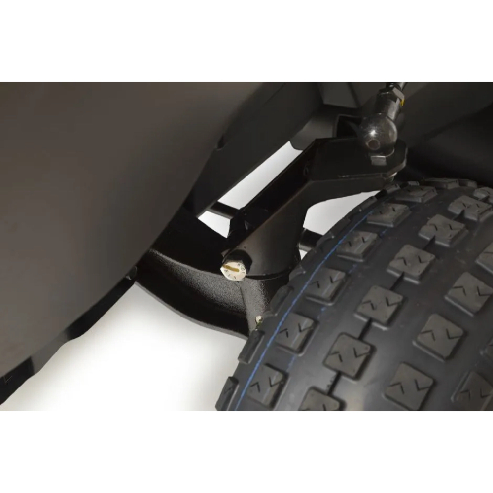 Thanks to its extra-wide 102cm cutter deck and twin synchronised blades that optimise airflow under the deck, this machine will cover a sizeable area in quick time and is capable of collecting long, damp grass without the discharge chute becoming blocked. A capacious 300-litre grass-collector means stops for emptying will be few and far between;
