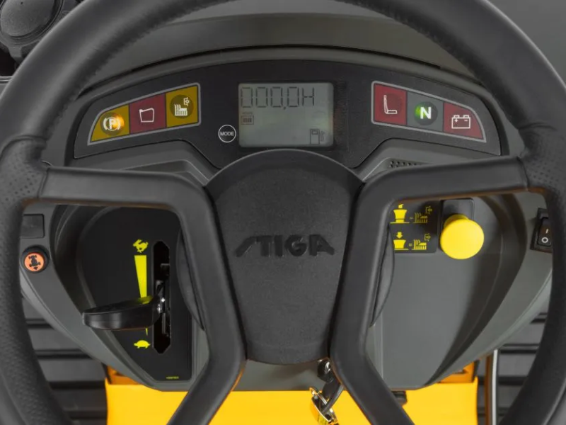 Developed with careful attention paid to operator comfort – and therefore a pleasure to drive – the Estate 7102 W combines a STIGA Premium soft-grip steering wheel with the Comfort Plus adjustable seat and effortless electromagnetic blade engagement. A heavy-duty front bumper protects the engine in the event of accidental impact.