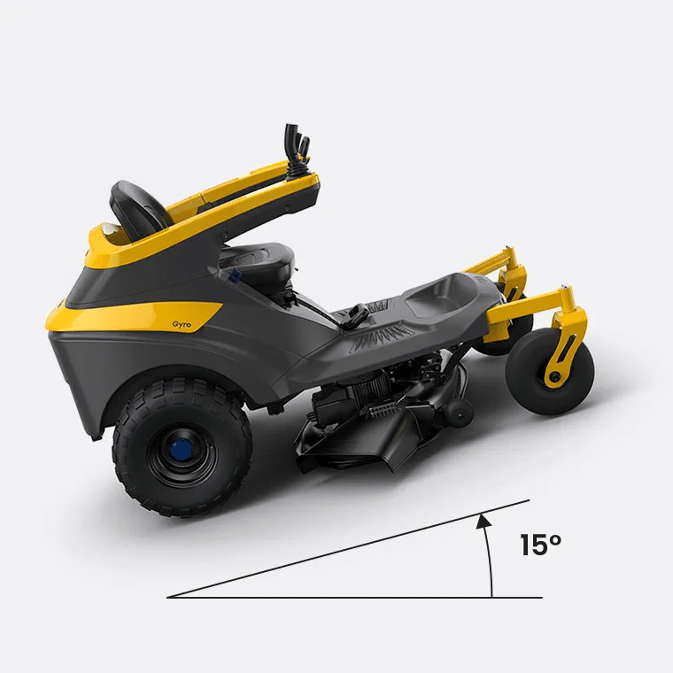 With clever weight distribution and a very low center of gravity (just 55.3 cm) Gyro has been developed and tested to operate safely and on inclines up to 15° – but tested to ensure a greater safety margin (roughly +20°) in comparison to the suggested use of the machine.