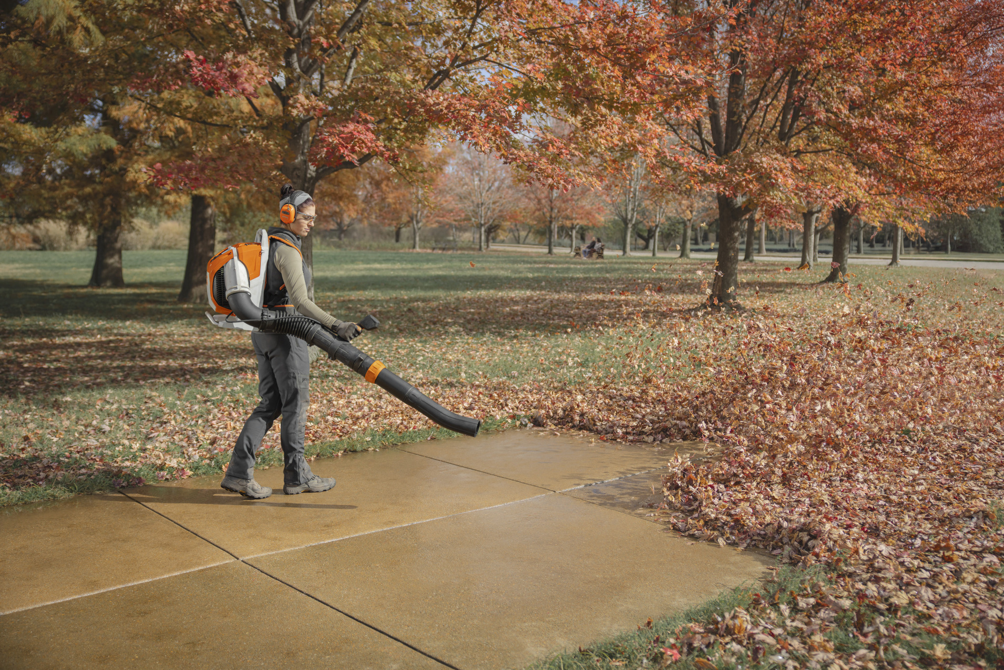 This blower is the ideal solution for demanding cleaning tasks, including clearing large areas in parks, fields, paths, and streets. Its high blowing force means it can shift heavy, wet leaves, damp grass, hedge trimmings, and other debris without hesitation. A key feature of STIHL’s AP System is the constant power output, which ensures the BRA 600 maintains its high performance throughout the entire battery charge, avoiding the gradual power drop seen in other systems.